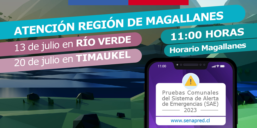 De esta forma, este jueves 13 de julio SENAPRED iniciará las pruebas SAE en Magallanes, realizando la primera, el mismo día 13 de julio en la comuna de Río Verde, y la segunda, el 20 de julio en la comuna de Timaukel.
