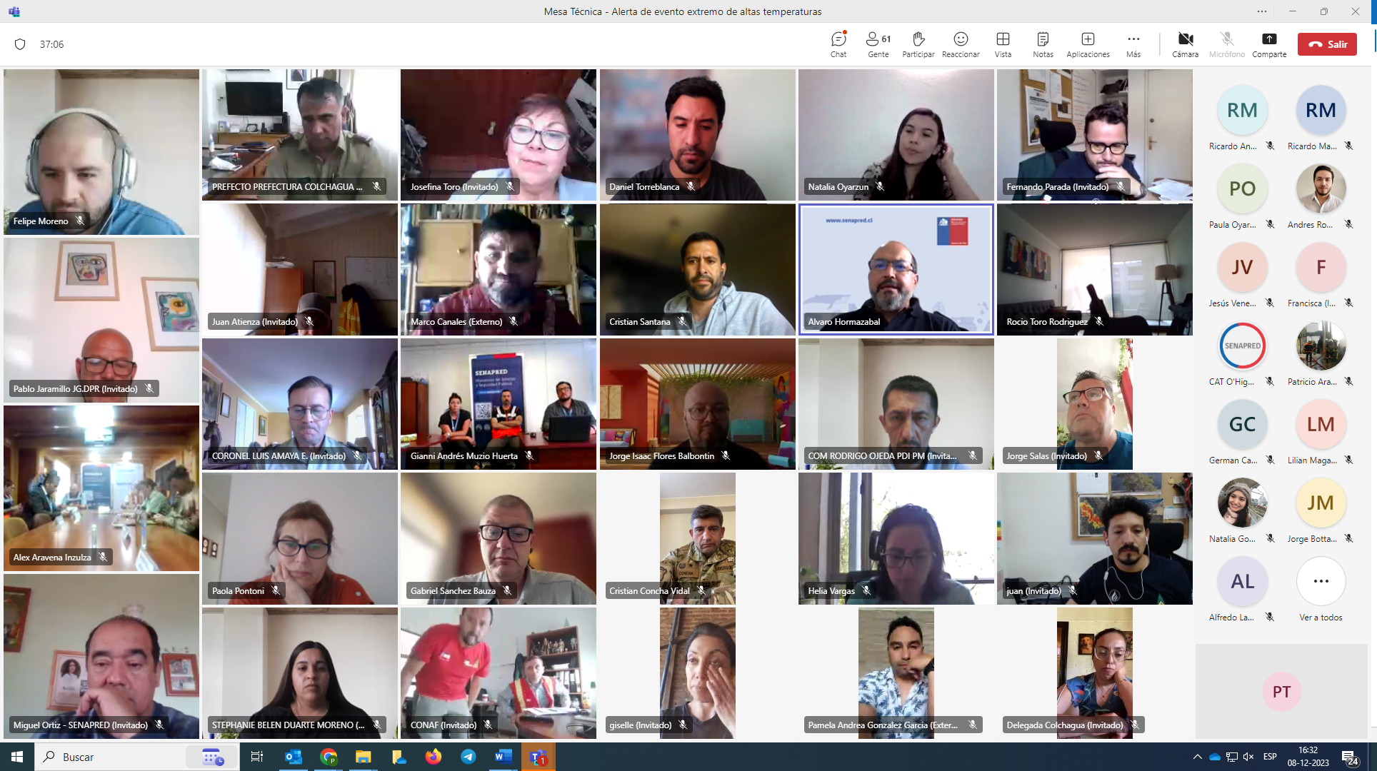 Esta tarde, el Director Nacional del Servicio Nacional de Prevención y Respuesta ante Desastres (SENAPRED), Álvaro Hormazábal, encabezó una mesa técnica por la Alerta Meteorológica emitida por la Dirección Meteorológica de Chile (DMC) pronosticando un evento de Altas Temperaturas Extremas que se desarrollará en diversas zonas de las regiones de Valparaíso, Metropolitana, O’Higgins y Maule. En la reunión participaron representantes de las Delegaciones Presidenciales Regionales junto a SENAPRED, DMC, CONAF y Ministerio de Salud.