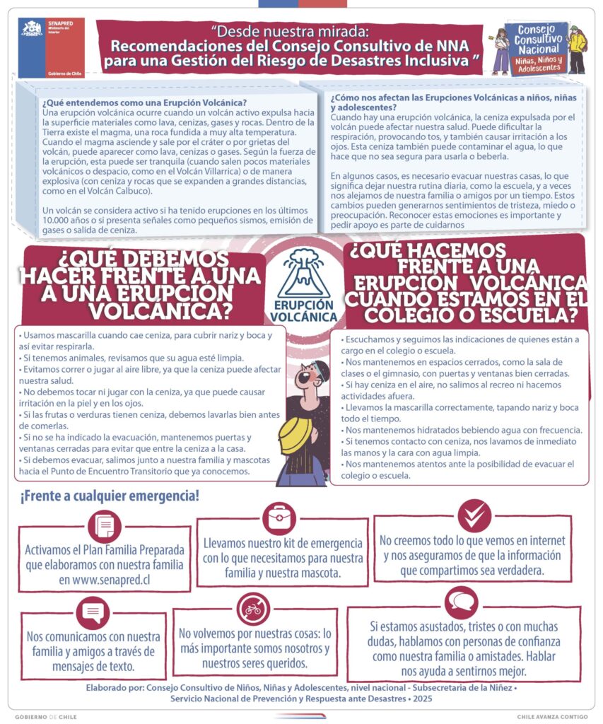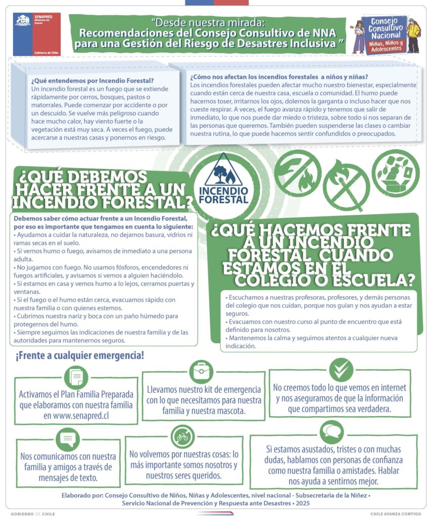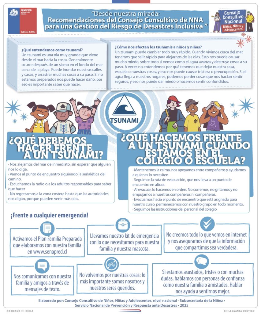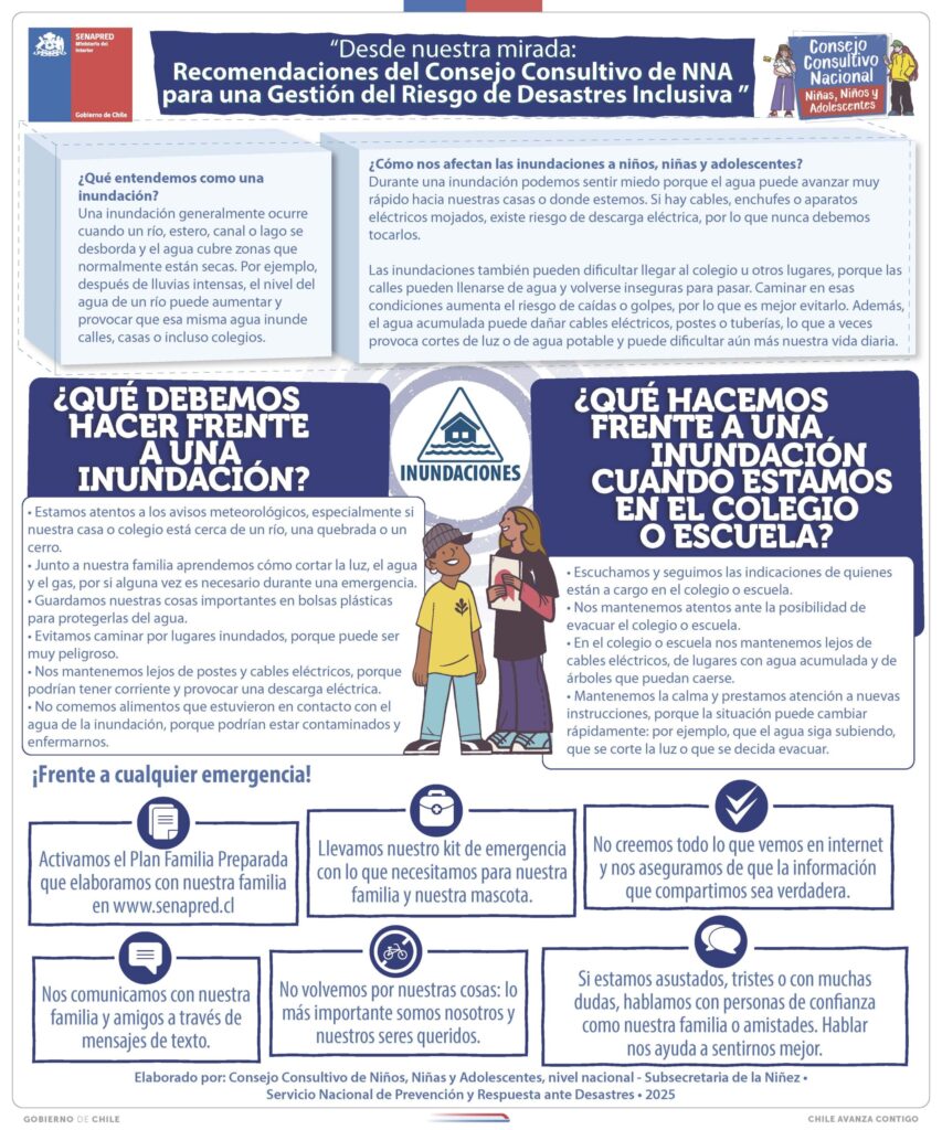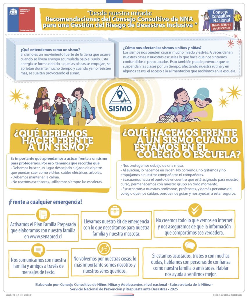 Este material inédito en el país es el fruto del trabajo del “Consejo Consultivo de Niños, Niñas y Adolescentes para una Gestión del Riesgo de Desastres Inclusiva”, instancia que busca representar las diversas voces de la niñez y adolescencia a lo largo del país, promoviendo su participación efectiva en materias asociadas a la prevención y preparación ante emergencias.