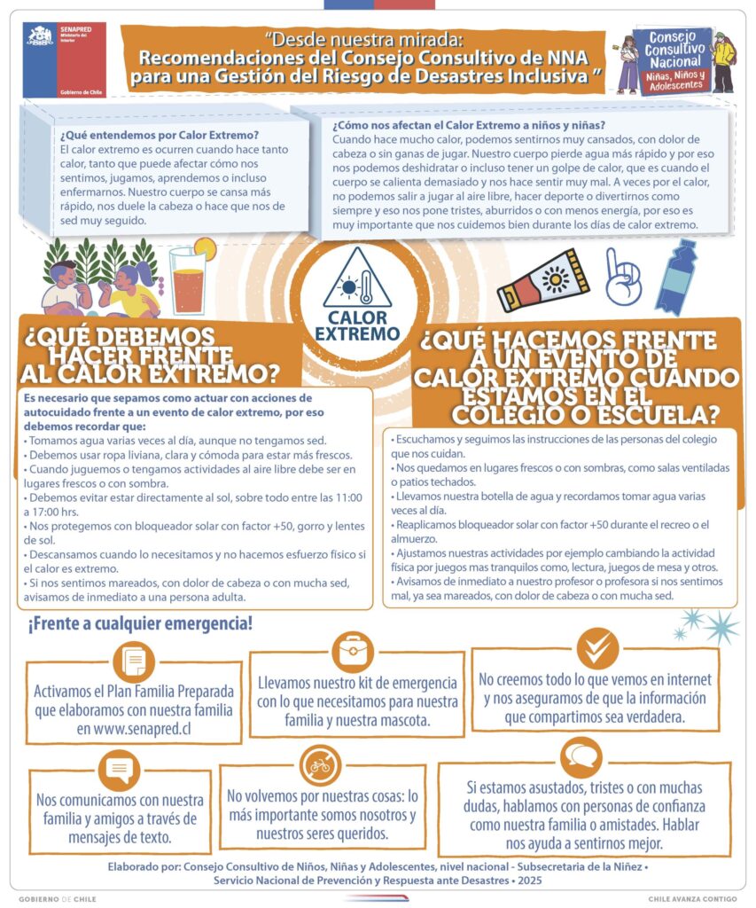 - La iniciativa que incluye orientaciones ante sismos, tsunamis, incendios forestales, calor extremo, inundaciones y erupciones volcánicas, contó con el apoyo y seguimiento de equipos técnicos de SENAPRED.